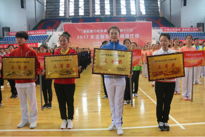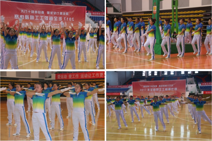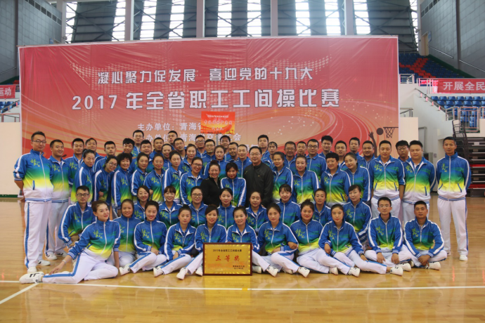 (集團黨群部 訊 劉麗萍/文攝)為認真貫徹落實全民健身綱要精神,喜迎黨的十九大順利召開,營造青海物產"全民健身、快樂工作、健康生活"的良好氛圍,展示廣大干部職工積極向上、團結協(xié)作、開拓創(chuàng)新、務實奮進的精神風貌。在集團黨委領導的高度重視下,在所屬公司的大力支持下,青海物產集團代表隊于2017年9月26日參加省總工會舉辦的"凝心聚力促發(fā)展、喜迎黨的十九大"全省職工工間操比賽,在26支參賽隊伍中脫穎而出,取得第三名(三等獎)的好成績。